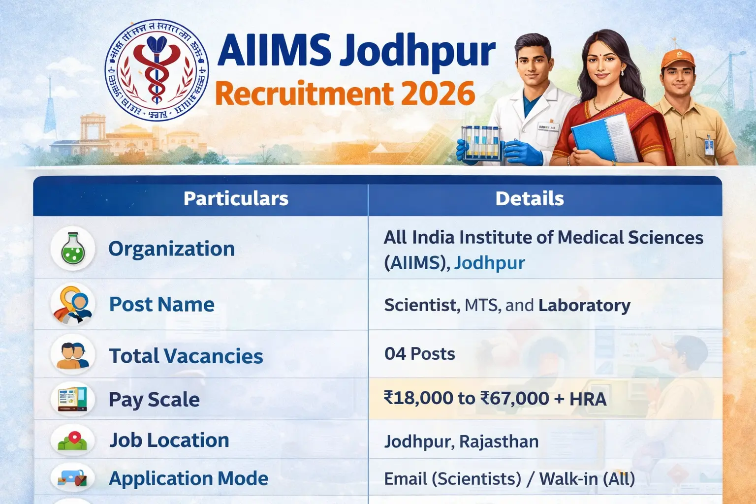 - Walk-in Reporting: For all posts, report to the 1st Floor, Dept. of Microbiology, Administration Building, AIIMS Jodhpur on April 25, 2026, at 9:00 AM.